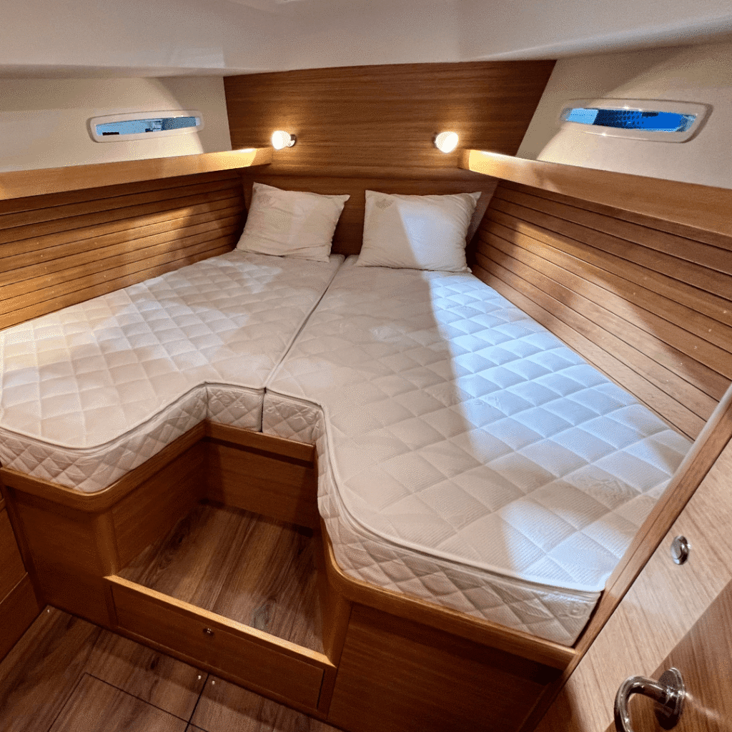 Ook slaapcomfort biedt tal van optimalisaties aan. Door te werken met matrashoogte, meerlagen dmv stevigheid en open structuur, pocketveren en – indien gewenst – een verenonderstel toe te voegen, evenaren we het comfort van thuis, aangepast aan de ruimte en dynamiek van jouw boot.